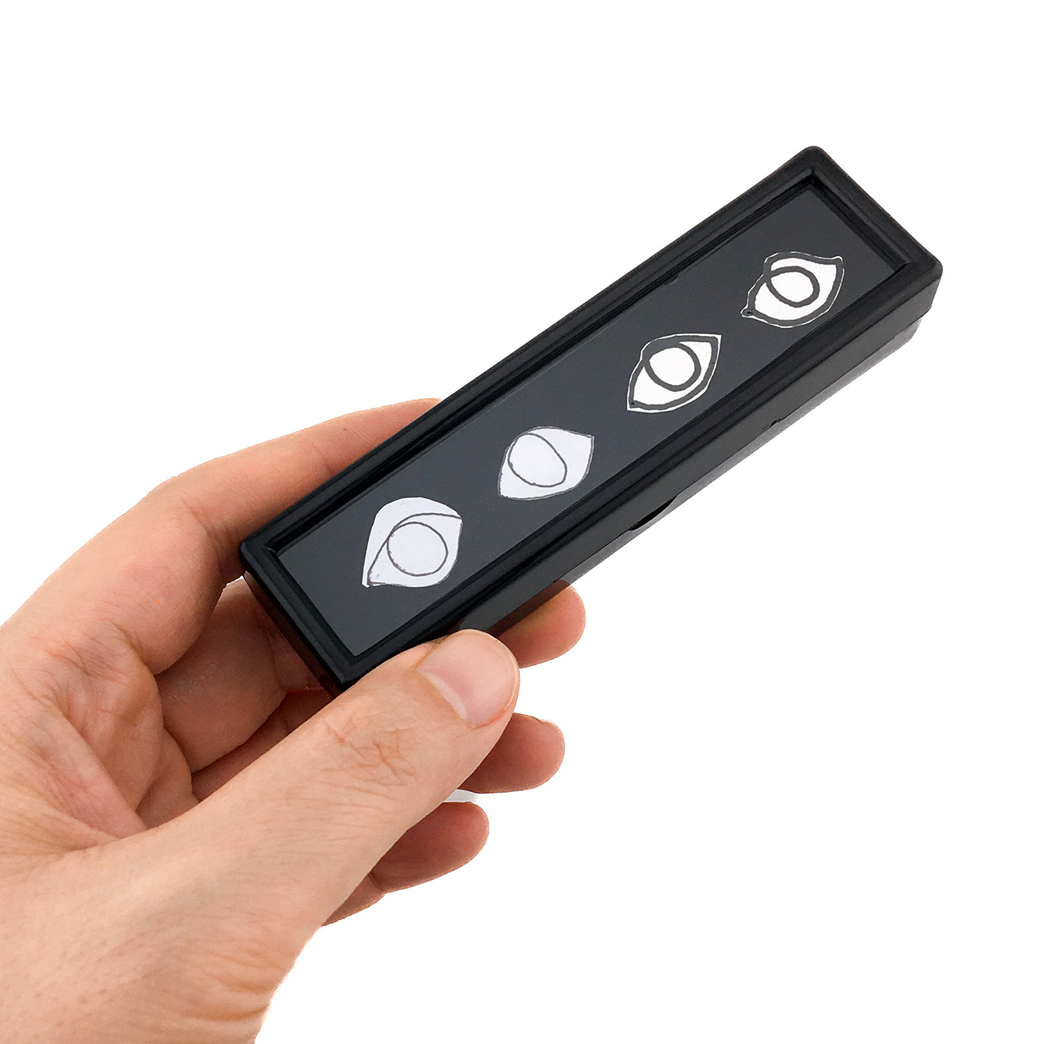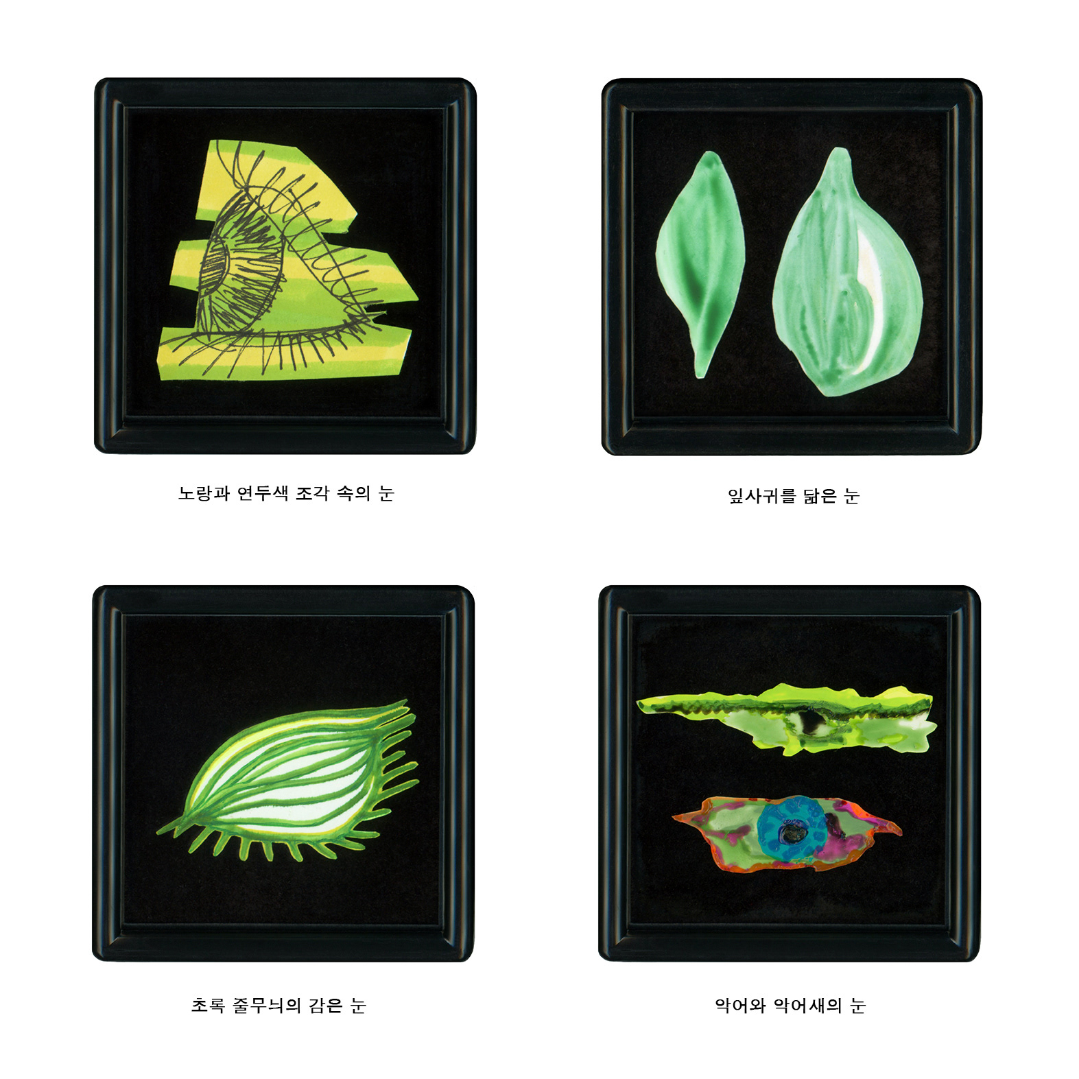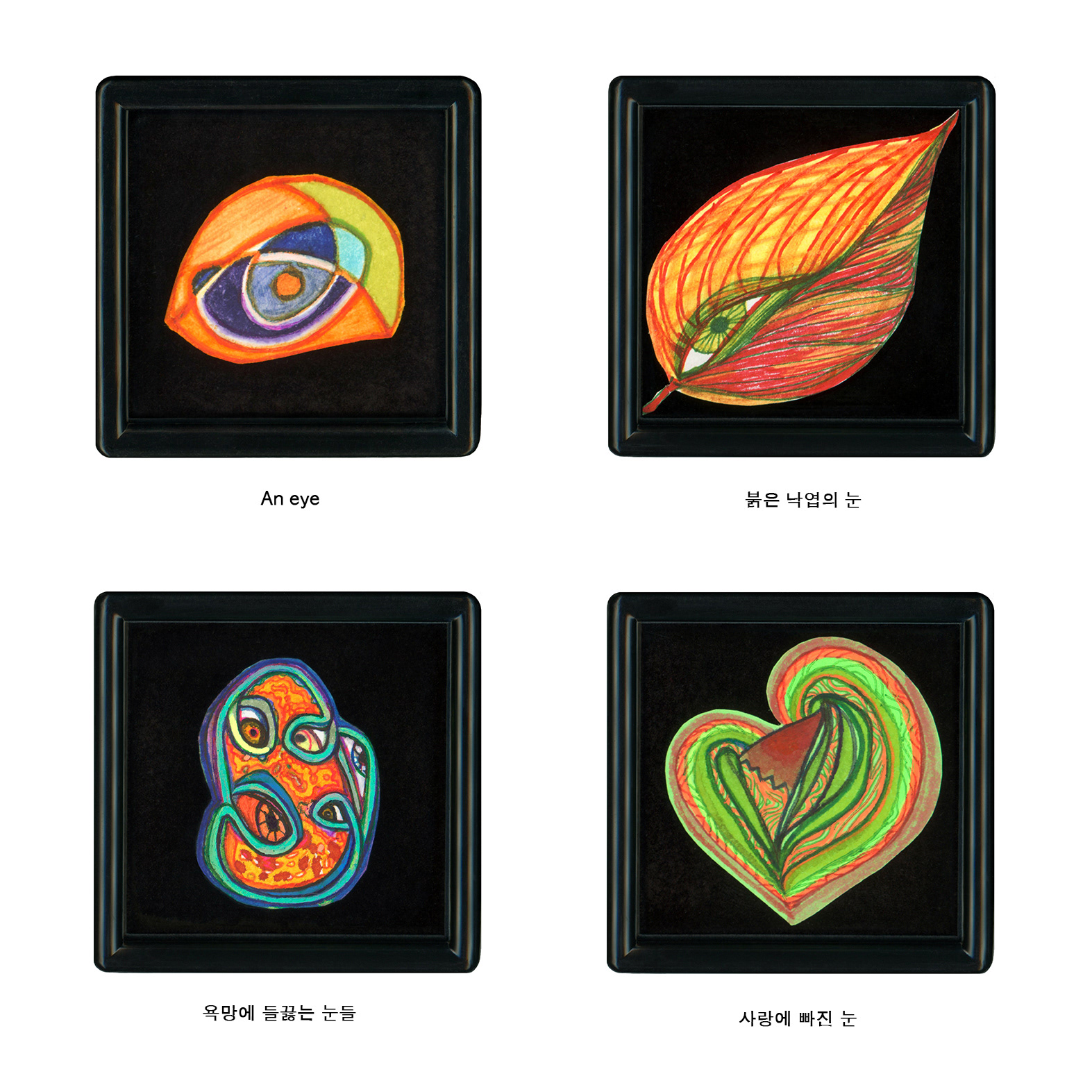 ‘Eyed Pieces'는 표본 상자에서 영감을 받은 초소형 원화 작품입니다. 개체 하나하나를 따로 담아 주목도를 높인 표본 상자처럼 눈 그림을 섬세하게 오려 검정 케이스에 담았습니다. 어두운 배경 속의 눈들은 또렷이 시선을 마주합니다.
